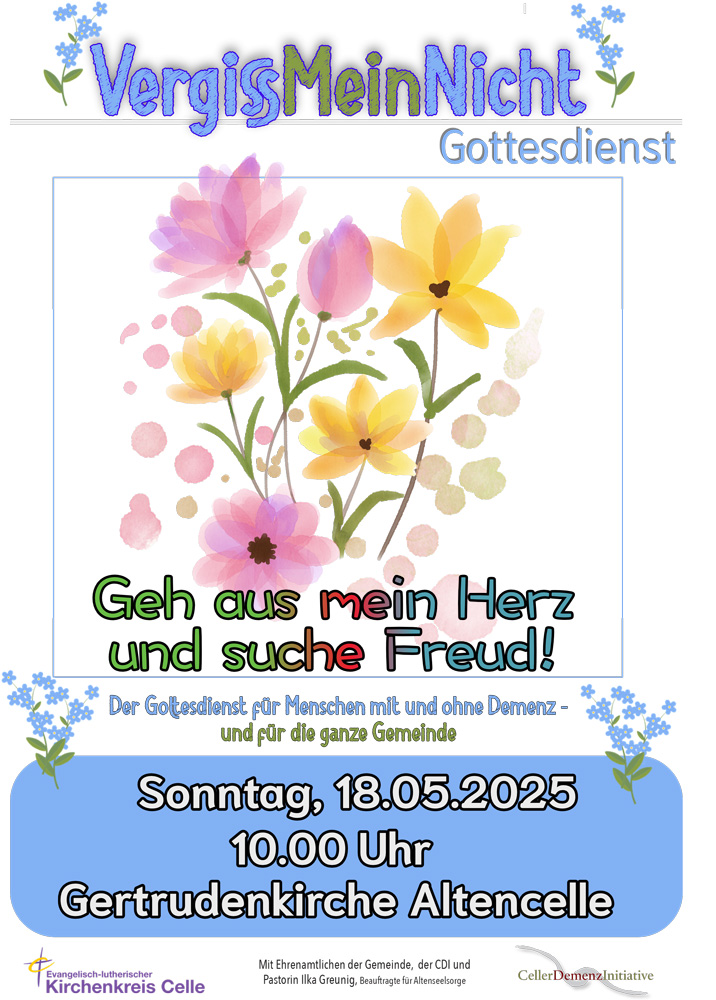 Der Ev.-luth. Kirchenkreis Celle feiert gemeinsam mit der Celler Demenz Initiative e.V. einen Gottesdienst für Menschen mit und ohne Demenz und deren An- und Zugehörigen. Gemeinsam wollen wir den Frühling feiern und uns über Gottes Schöpfung freuen.